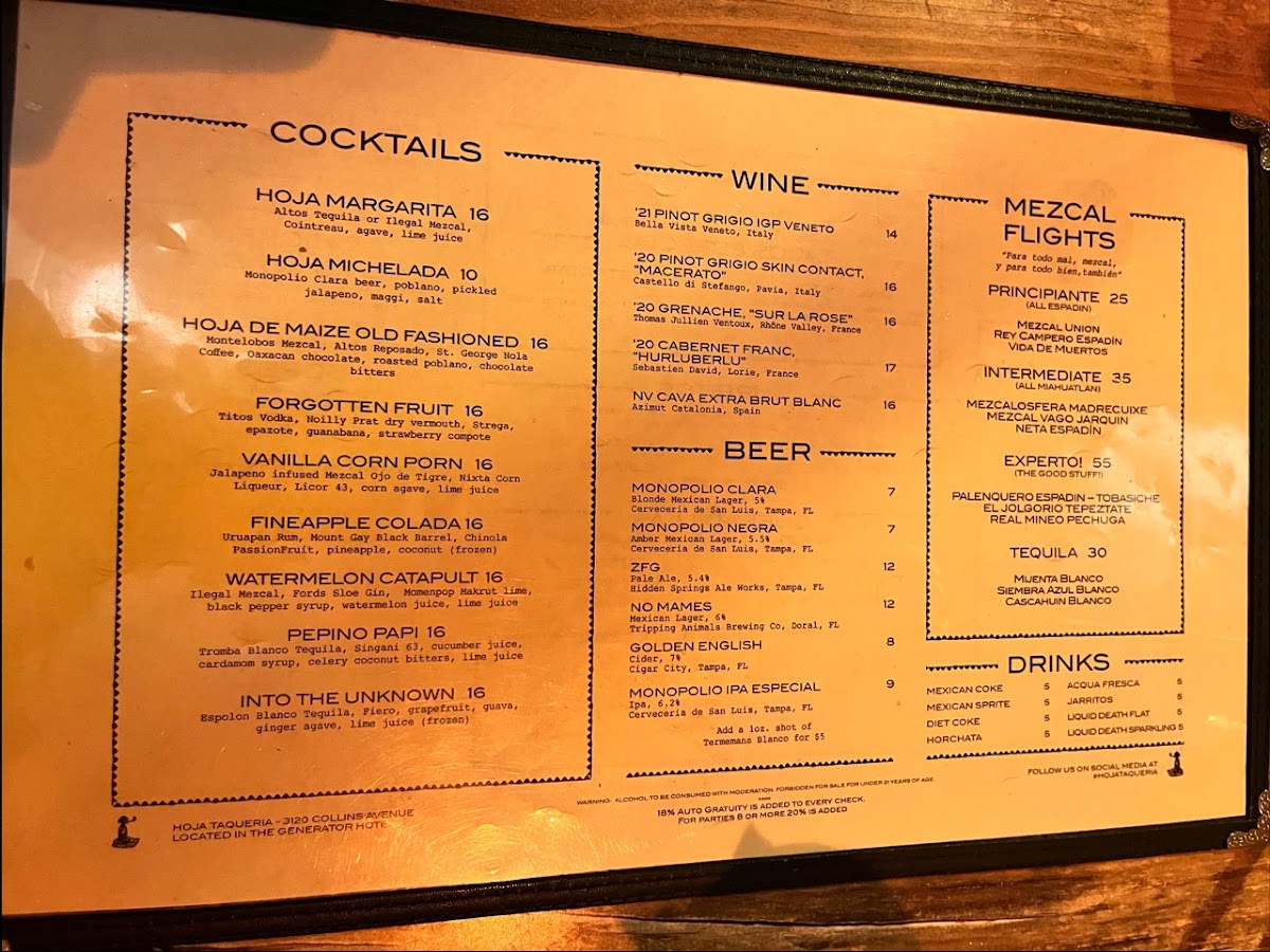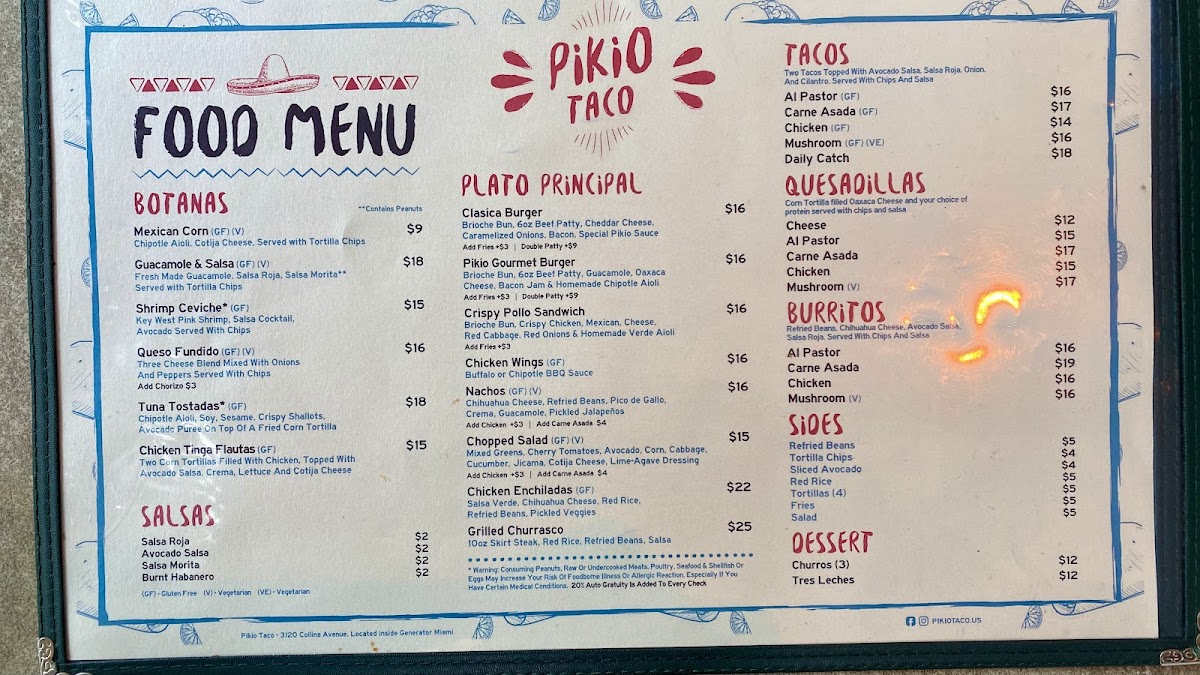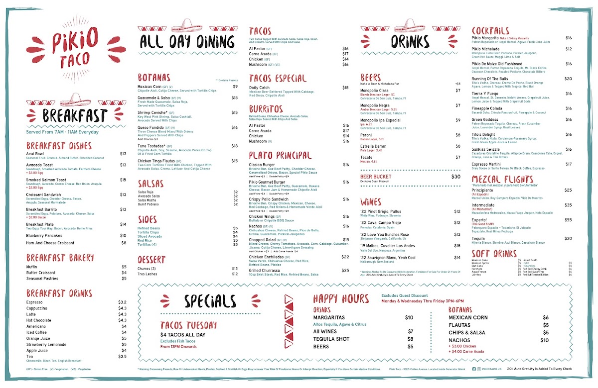 Pikio Taco is a vibrant Mexican eatery that captures the essence of authentic flavors in a cozy setting. Nestled in the heart of South Beach, this charming spot invites guests to indulge in dishes bursting with freshness and zest. Diners rave about the shrimp ceviche and cod tacos, perfectly complemented by house-made salsas and guacamole. With a focus on quality, each dish showcases expertly prepared ingredients, including succulent meats and vibrant spices. The ambiance is lively yet relaxed, making it perfect for casual dining or happy hour. Don't miss their renowned Mezcal flights for a true taste of Mexico!